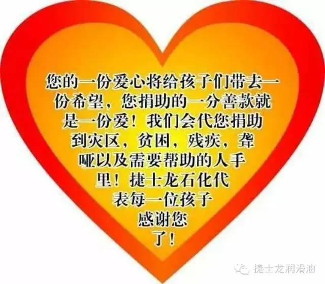 2015年6月1日伴随着欢快的儿童节,浙江捷士龙石化有限公司慈善基金会正式启动,至今一个多月募捐筹款1万元整。在此感谢您选择使用捷士龙公司每一款产品,您每使用一瓶一桶我们将为灾区,残疾,聋哑儿童捐助0.1元。代表孩子们感谢您!
